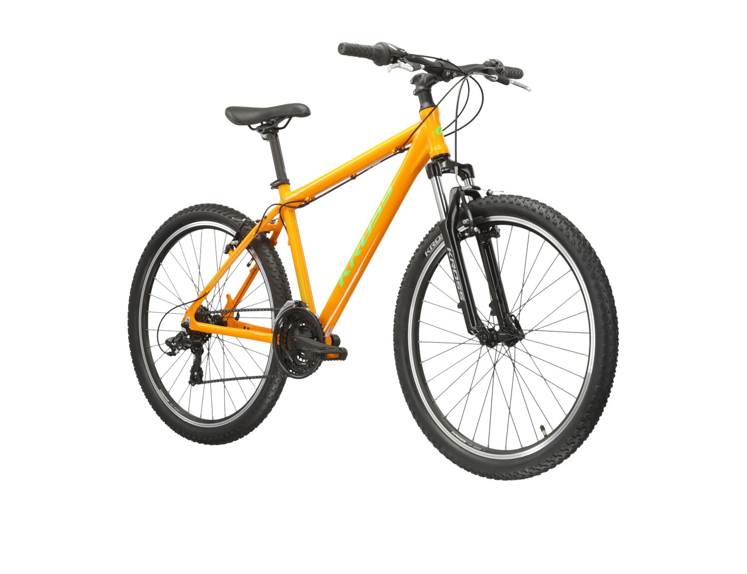 W celu maksymalnej ochrony naszych ram stworzyliśmy system wymiennych haków, które w razie uszkodzenia można łatwo i szybko wymienić. Aby ograniczyć możliwość uszkodzenia ramy do minimum gwinty umieszczamy na haku lub na specjalnej nakrętce. Sposób malowania polegający na nakładaniu naelektryzowanych cząstek farby proszkowej na aluminium, które wymagają obróbki termicznej. Po spieczeniu powierzchnia lakieru tworzy idealnie gładką powłokę wyjątkowo odporną na uszkodzenia mechaniczne.Rowery górskie Kross to doskonałe narzędzia do podbijania trudnych szlaków terenowych, łączące wytrzymałe konstrukcje z zaawansowanymi technologiami amortyzacyjnymi. Z solidnymi ramami, precyzyjnymi hamulcami i innowacyjnymi systemami przerzutek modele MTB Kross są stworzone, by sprostać wyzwaniom bezdroży i dostarczyć pasjonatom jazdy terenowej niezapomnianych przygód. KROSS HEXAGON 1.0 Każdy z nas chce czasem wyjechać z miasta i odpocząć w lesie z dala od cywilizacji. Albo rzucić to wszystko i wyjechać w Bieszczady. Nie warto pozwolić, żeby w takich sytuacjach ograniczał nas rower. Dla wszystkich, którzy cenią sobie uniwersalność w przystępnej cenie powstał KROSS Hexagon 1.0. To budżetowy rower miejski z możliwością zamontowania szerszej, terenowej opony. Wygodna geometria pozwala przyjąć zrelaksowaną, ułatwiającą obserwację otoczenia, pozycję za kierownicą. Osprzęt do każdego terenu KROSS Hexagon 1.0 to doskonały wybór dla każdego szukającego roweru uniwersalnego. Sprawdzony napęd z 21 przełożeniami zapewnia bezproblemową i tanią eksploatację. Tylna przerzutka z grupy Tourney to trwała i sprawdzona konstrukcja, która zapewnia płynną i responsywną zmianę przełożeń również w trudniejszym terenie. Za pewne i przewidywalne hamowanie odpowiadają hamulce v-brake, które oferują wysoką siłę hamowania niezależnie od aktualnych warunków atmosferycznych. Są lżejsze, dużo prostsze i tańsze w eksploatacji niż hamulce tarczowe, a również potrafią skutecznie zatrzymać rower. Technologie wspierające Cię w Twoich podróżach rowerowych Rama KROSS Hexagon 1.0 została wykonana z aluminium 6061. Ten specjalny stop aluminium sprawia, że rower jest sztywny i odporny na złamania. Jednocześnie, jest to stosunkowo lekki materiał, który może zaskoczyć niejednego rowerzystę swoimi właściwościami. Rama jest malowana proszkowo, co przekłada się na trwałość malowania oraz odporność lakieru na uszkodzenia mechaniczne. Amortyzowany widelec ze skokiem 80 mm zapewnia wysoką kulturę pracy oraz doskonałe tłumienie wibracji powstających podczas jazdy po nierównej i wyboistej nawierzchni.