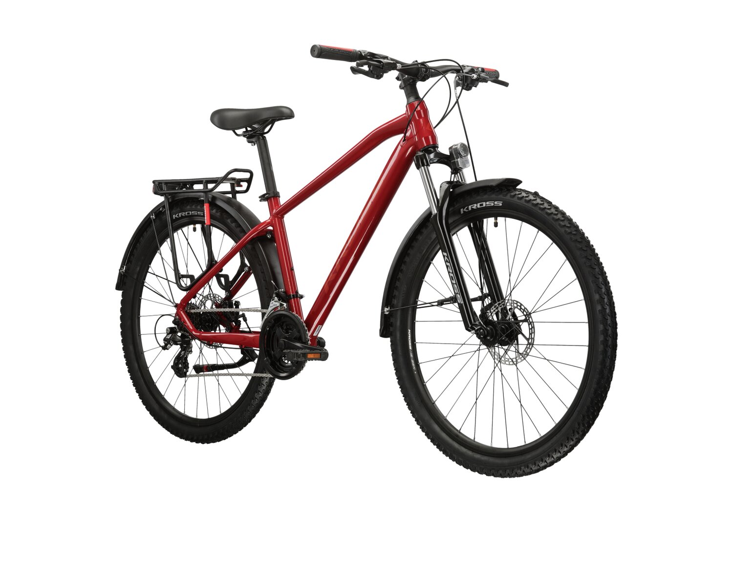 Wewnętrzne prowadzenie kabli wydłuża żywotność linek i pancerzy chroniąc je przed błotem, piachem czy deszczem. W celu maksymalnej ochrony naszych ram stworzyliśmy system wymiennych haków, które w razie uszkodzenia można łatwo i szybko wymienić. Aby ograniczyć możliwość uszkodzenia ramy do minimum gwinty umieszczamy na haku lub na specjalnej nakrętce. Hamulce tarczowe gwarantują nam dużą siłę hamowania i dobrą modulację nawet w najcięższych warunkach pogodowych, a ich żywotność jest znacznie dłuższa niż hamulców tradycyjnych. Sposób malowania polegający na nakładaniu naelektryzowanych cząstek farby proszkowej na aluminium, które wymagają obróbki termicznej. Po spieczeniu powierzchnia lakieru tworzy idealnie gładką powłokę wyjątkowo odporną na uszkodzenia mechaniczne. Precyzja hamowania wzrasta dzięki wyeliminowaniu zbędnych przejściówek co wpływa na sztywność połączenia między ramą a zaciskiem. Lepsze odprowadzanie ciepła wydłuża żywotność hamulca i poprawia efektywność jego działania. Rowery górskie Kross to doskonałe narzędzia do podbijania trudnych szlaków terenowych, łączące wytrzymałe konstrukcje z zaawansowanymi technologiami amortyzacyjnymi. Z solidnymi ramami, precyzyjnymi hamulcami tarczowymi i innowacyjnymi systemami przerzutek modele MTB Kross są stworzone, by sprostać wyzwaniom bezdroży i dostarczyć pasjonatom jazdy terenowej niezapomnianych przygód. KROSS HEXAGON 2.0 EQ KROSS Hexagon 2.0 EQ to rower, który da radę wykonać każde zadanie jakie przed nim postawisz. Doskonale sprawdzi się na miejskich ścieżkach rowerowych, a także na piaszczystych, leśnych trasach. Niezależnie jaką trasę wybierzesz nasz rekreacyjny rower górski pomoże Ci ją pokonać. Sprawdzone rozwiązania technologiczne to tylko dodatek do przygód, które przeżyjesz ze swoim nowym towarzyszem. Osprzęt do każdego terenu KROSS Hexagon 2.0 EQ to doskonały wybór dla każdego szukającego roweru uniwersalnego. Sprawdzony napęd z 21 przełożeniami zapewnia bezproblemową i tanią eksploatację. Tylna przerzutka z grupy Altus to trwała i sprawdzona konstrukcja, która zapewnia płynną i responsywną zmianę przełożeń również w trudniejszym terenie. By hamowanie zawsze było przewidywalne, niezależnie od warunków atmosferycznych czy sytuacji na drodze zamontowane zostały mechaniczne hamulce tarczowe. Zapewniają one dużą wyższą siłę hamowania niż klasyczne hamulce v-brake. A dzięki mechanicznym zaciskom hamulców także bezawaryjność i łatwy serwis nawet w trakcie wycieczki rowerowej.Idealny do codziennego użytkowania Wersja EQ(equipped) naszego roweru KROSS Hexagon 2.0 EQ EQ została dodatkowo wyposażona w przydatne akcesoria. Zintegrowane z rowerem oświetlenie ułatwi jazdę po zmroku, a bagażnik umożliwi przewożenie niezbędnego ekwipunku, czy też montaż dodatkowych sakw. Do kompletu trafił również system pełnych błotników, który zapewnia doskonałą ochronę przed błotem, a podpórka eliminuje konieczność szukania oparcia dla roweru. Technologie wspierające Cię w Twoich podróżach rowerowych Rama KROSS Hexagon 2.0 EQ została wykonana z aluminium 6061. Ten specjalny stop aluminium sprawia, że rower jest sztywny i odporny na złamania. Jednocześnie, jest to stosunkowo lekki materiał, który może zaskoczyć niejednego rowerzystę swoimi właściwościami. Rama jest malowana proszkowo, co przekłada się na trwałość malowania oraz odporność lakieru na uszkodzenia mechaniczne. Przy projektowaniu ramy postanowiliśmy wyposażyć ją w wewnętrzne prowadzenie linek. Dzięki temu sprawiliśmy, że rower wygląda estetycznie i schludnie, przez co może stanowić doskonały środek dojazdowy do pracy dla wielu osób. Ten system prowadzenia linek pozwolił nam także na zmniejszenie ryzyka zerwania linki w trakcie jazdy w terenie. Amortyzowany widelec ze skokiem 100 mm zapewnia wysoką kulturę pracy oraz doskonałe tłumienie wibracji powstających podczas jazdy po nierównej i wyboistej nawierzchni.