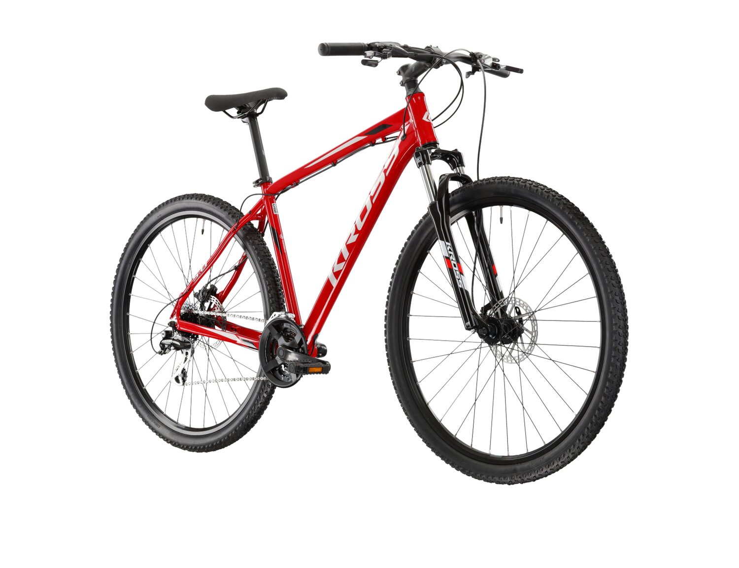 Wewnętrzne prowadzenie kabli wydłuża żywotność linek i pancerzy chroniąc je przed błotem, piachem czy deszczem. W celu maksymalnej ochrony naszych ram stworzyliśmy system wymiennych haków, które w razie uszkodzenia można łatwo i szybko wymienić. Aby ograniczyć możliwość uszkodzenia ramy do minimum gwinty umieszczamy na haku lub na specjalnej nakrętce. Hamulce tarczowe gwarantują nam dużą siłę hamowania i dobrą modulację nawet w najcięższych warunkach pogodowych, a ich żywotność jest znacznie dłuższa niż hamulców tradycyjnych. Sposób malowania polegający na nakładaniu naelektryzowanych cząstek farby proszkowej na aluminium, które wymagają obróbki termicznej. Po spieczeniu powierzchnia lakieru tworzy idealnie gładką powłokę wyjątkowo odporną na uszkodzenia mechaniczne. Precyzja hamowania wzrasta dzięki wyeliminowaniu zbędnych przejściówek co wpływa na sztywność połączenia między ramą a zaciskiem. Lepsze odprowadzanie ciepła wydłuża żywotność hamulca i poprawia efektywność jego działania. Rowery górskie Kross to doskonałe narzędzia do podbijania trudnych szlaków terenowych, łączące wytrzymałe konstrukcje z zaawansowanymi technologiami amortyzacyjnymi. Z solidnymi ramami, precyzyjnymi hamulcami tarczowymi i innowacyjnymi systemami przerzutek modele MTB Kross są stworzone, by sprostać wyzwaniom bezdroży i dostarczyć pasjonatom jazdy terenowej niezapomnianych przygód. KROSS HEXAGON 5.0 KROSS Hexagon 5.0 to rower, który może wprowadzić w kolarstwo górskie, a jednocześnie bez problemu posłuży jako rower do jazdy po mieście. Czerpie on garściami z rozwiązań z naszych rowerów z segmentu MTB hardtail, dzięki czemu poradzi sobie w trudniejszym terenie. Wyposażyliśmy go w sprawdzony osprzęt, przez co bez problemu odnajdziesz się w mieście, a także będziesz mógł na nim spróbować swoich sił w pierwszych maratonach MTB. Osprzęt do każdego terenu KROSS Hexagon 5.0 to doskonały wybór dla każdego szukającego roweru uniwersalnego. Sprawdzony napęd Shimano z 18 przełożeniami zapewnia bezproblemową i tanią eksploatację. Tylna przerzutka z grupy Cues to trwała i sprawdzona konstrukcja, która zapewnia płynną i responsywną zmianę przełożeń również w trudniejszym terenie. By zapewnić pewność hamowania w każdych warunkach zamontowane zostały hydrauliczne hamulce tarczowe Shimano. Zapewniają one dużą większą siłę hamowania niż klasyczne hamulce v-brake. To także dużo większa i precyzyjniejsza modulacja siły hamowania niż w przypadku mechanicznych hamulców tarczowych. Technologie wspierające Cię w Twoich podróżach rowerowych Rama KROSS Hexagon 5.0 została wykonana z aluminium 6061. Ten specjalny stop aluminium sprawia, że rower jest sztywny i odporny na złamania. Jednocześnie, jest to stosunkowo lekki materiał, który może zaskoczyć niejednego rowerzystę swoimi właściwościami. Rama jest malowana proszkowo, co przekłada się na trwałość malowania oraz odporność lakieru na uszkodzenia mechaniczne. Przy projektowaniu ramy postanowiliśmy wyposażyć ją w wewnętrzne prowadzenie linek. Dzięki temu sprawiliśmy, że rower wygląda estetycznie i schludnie, przez co może stanowić doskonały środek dojazdowy do pracy dla wielu osób. Ten system prowadzenia linek pozwolił nam także na zmniejszenie ryzyka zerwania linki w trakcie jazdy w terenie. Amortyzowany widelec SR Suntour ze skokiem 100 mm zapewnia wysoką kulturę pracy oraz doskonałe tłumienie wibracji powstających podczas jazdy po nierównej i wyboistej nawierzchni. Dodatkowo, na kierownicy znajduje się manetka blokady amortyzatora, która umożliwia zwiększenie efektywności pedałowania na płaskich odcinkach drogi.