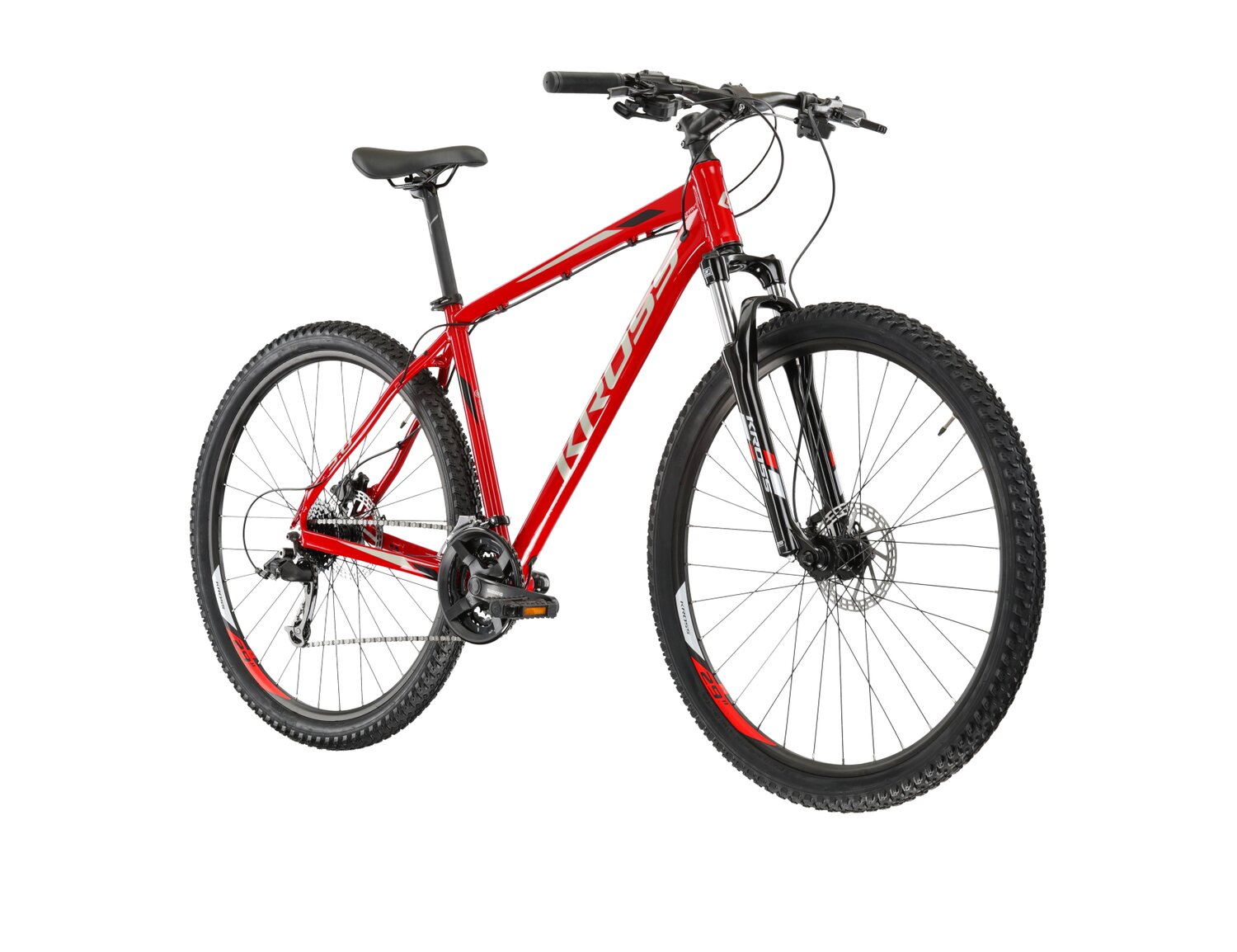 W celu maksymalnej ochrony naszych ram stworzyliśmy system wymiennych haków, które w razie uszkodzenia można łatwo i szybko wymienić. Aby ograniczyć możliwość uszkodzenia ramy do minimum gwinty umieszczamy na haku lub na specjalnej nakrętce. Hamulce tarczowe gwarantują nam dużą siłę hamowania i dobrą modulację nawet w najcięższych warunkach pogodowych, a ich żywotność jest znacznie dłuższa niż hamulców tradycyjnych. Precyzja hamowania wzrasta dzięki wyeliminowaniu zbędnych przejściówek co wpływa na sztywność połączenia między ramą a zaciskiem. Lepsze odprowadzanie ciepła wydłuża żywotność hamulca i poprawia efektywność jego działania. Sposób malowania polegający na nakładaniu naelektryzowanych cząstek farby proszkowej na aluminium, które wymagają obróbki termicznej. Po spieczeniu powierzchnia lakieru tworzy idealnie gładką powłokę wyjątkowo odporną na uszkodzenia mechaniczne.Rowery górskie Kross to doskonałe narzędzia do podbijania trudnych szlaków terenowych, łączące wytrzymałe konstrukcje z zaawansowanymi technologiami amortyzacyjnymi. Z solidnymi ramami, precyzyjnymi hamulcami tarczowymi i innowacyjnymi systemami przerzutek modele MTB Kross są stworzone, by sprostać wyzwaniom bezdroży i dostarczyć pasjonatom jazdy terenowej niezapomnianych przygód. KROSS HEXAGON 5.0 KROSS Hexagon 5.0 to rower, który może wprowadzić w kolarstwo górskie, a jednocześnie bez problemu posłuży jako rower do jazdy po mieście. Czerpie on garściami z rozwiązań z naszych rowerów z segmentu MTB hardtail, dzięki czemu poradzi sobie w trudniejszym terenie. Wyposażyliśmy go w sprawdzony osprzęt, przez co bez problemu odnajdziesz się w mieście, a także będziesz mógł na nim spróbować swoich sił w pierwszych maratonach MTB. Osprzęt do każdego terenu KROSS Hexagon 5.0 to doskonały wybór dla każdego szukającego roweru uniwersalnego. Sprawdzony napęd z 24 przełożeniami zapewnia bezproblemową i tanią eksploatację. Tylna przerzutka Microshift to trwała i sprawdzona konstrukcja, która zapewnia płynną i responsywną zmianę przełożeń również w trudniejszym terenie. By zapewnić pewność hamowania w każdych warunkach zamontowane zostały hydrauliczne hamulce tarczowe. Zapewniają one dużą większą siłę hamowania niż klasyczne hamulce v-brake. To także dużo większa i precyzyjniejsza modulacja siły hamowania niż w przypadku mechanicznych hamulców tarczowych. Technologie wspierające Cię w Twoich podróżach rowerowych Rama KROSS Hexagon 5.0 została wykonana z aluminium 6061. Ten specjalny stop aluminium sprawia, że rower jest sztywny i odporny na złamania. Jednocześnie, jest to stosunkowo lekki materiał, który może zaskoczyć niejednego rowerzystę swoimi właściwościami. Rama jest malowana proszkowo, co przekłada się na trwałość malowania oraz odporność lakieru na uszkodzenia mechaniczne. Amortyzowany widelec SR Suntour ze skokiem 80 mm zapewnia wysoką kulturę pracy oraz doskonałe tłumienie wibracji powstających podczas jazdy po nierównej i wyboistej nawierzchni.