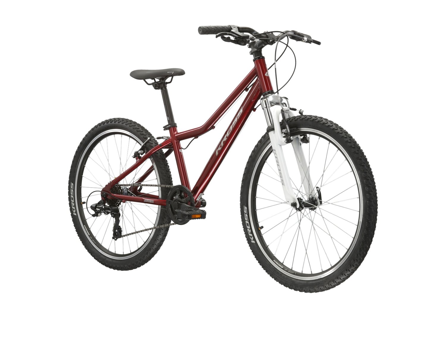 KROSS JUNIOR 1.0 Wzorując się na „dorosłych” modelach rowerów KROSS, stworzyliśmy KROSS Junior 1.0. To rekreacyjny dziecięcy rower górski, który doskonale odnajdzie się zarówno podczas dojazdu do szkoły, jak i podczas weekendowych, rodzinnych wycieczek poza miasto. KROSS Junior 1.0 to dorosłe rozwiązania techniczne zamknięte w mniejszej, dostosowanej do dziecięcego wzrostu ramie. Osprzęt do każdego terenu Rower KROSS Junior 1.0 został wyposażony w napęd w systemie 1×8. Umożliwi to sprawne pokonywanie podjazdów oraz szybką jazdę po płaskich odcinkach. Tylna przerzutka od Shimano to trwała i sprawdzona konstrukcja, która zapewnia płynną zmianę przełożeń. Za pewne i przewidywalne hamowanie odpowiadają hamulce v-brake, które oferują wysoką siłę hamowania niezależnie od aktualnych warunków atmosferycznych. Są lżejsze, dużo prostsze i tańsze w eksploatacji niż hamulce tarczowe, a również potrafią skutecznie zatrzymać rower. Technologie zapewniające komfort użytkowania Rama KROSS Junior 1.0 została wykonana z aluminium 6061. Ten specjalny stop aluminium sprawia, że rower jest sztywny i odporny na złamania. Jednocześnie, jest to stosunkowo lekki materiał, który może zaskoczyć niejednego rowerzystę swoimi właściwościami. Rama jest malowana proszkowo, co przekłada się na trwałość malowania oraz odporność lakieru na uszkodzenia mechaniczne. Amortyzowany widelec ze skokiem 40 mm zapewnia wysoką kulturę pracy oraz doskonałe tłumienie wibracji powstających podczas jazdy po nierównej i wyboistej nawierzchni. Obniżony przekrok ramy zapewnia, że wsiadania oraz zsiadanie z roweru nie będzie stanowiło żadnego problemu.