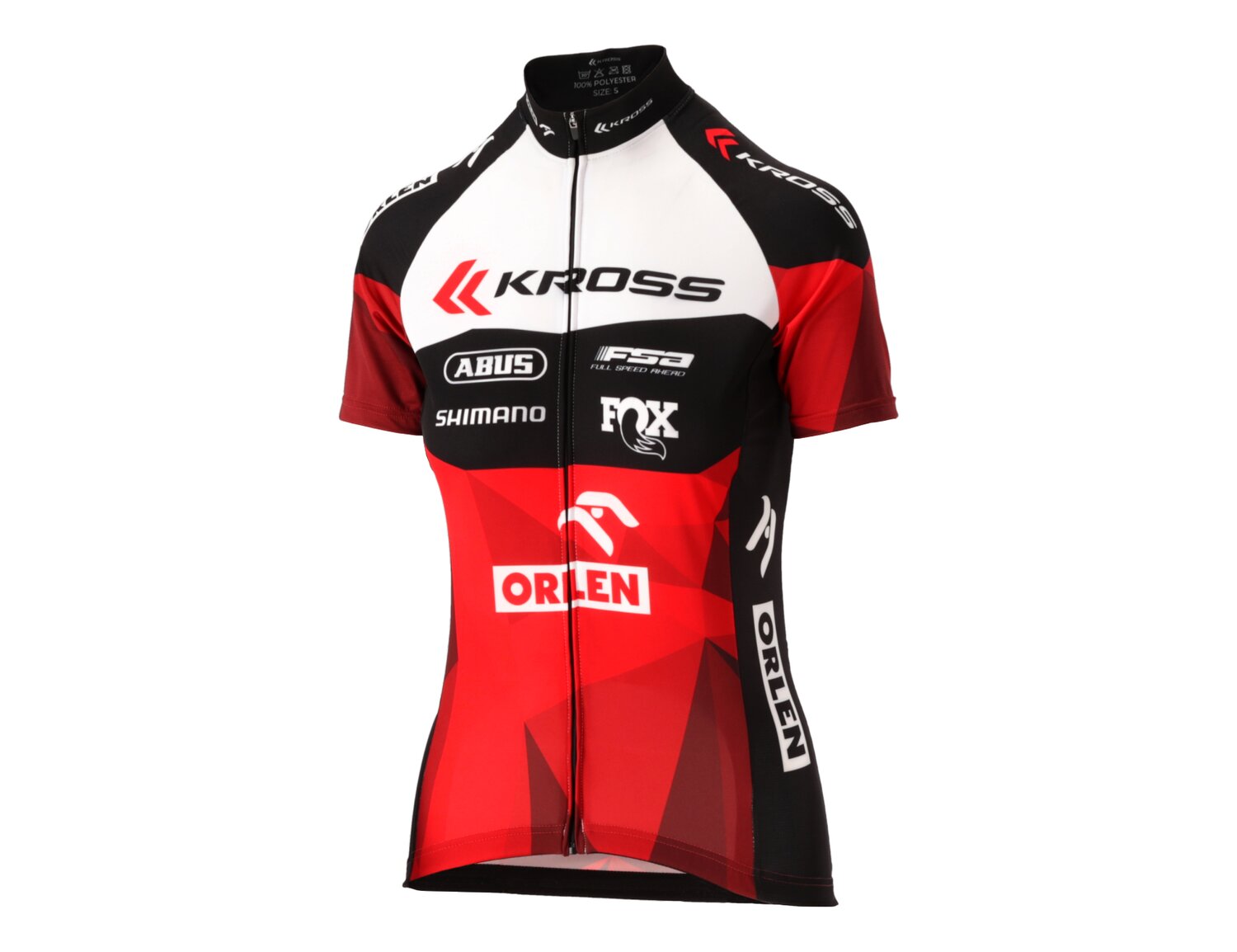 DAMSKA KOSZULKA ROWEROWA Z KRÓTKIM RĘKAWKIEM KROSS ORLEN CYCLING TEAM Podziwiasz zawodników zawodników KROSS Orlen Cycling Team i podoba Ci się ich koszulka rowerowa, w której startują na najtrudniejszych wyścigach Pucharu Świata XC? W takim razie w Twojej garderobie musi znaleźć się ta kobieca koszulka rowerowa. Jest to dokładna replika odzieży w jakiej startują nasi zawodnicy – została wykonana z tych samych materiałów oraz przy użyciu tych samych technologii. Niezależnie czy planujesz wykorzystać tę koszulkę do spokojnych jazd, treningów czy startu w wyścigach możesz mieć pewność, że zadba ona o Twój komfort w trakcie jazdy oraz poprawi aerodynamikę w porównaniu z innymi koszulkami rowerowymi.Profesjonalna koszulka rowerowa dla kobiet Damska koszulka rowerowa z krótkim rękawkiem KROSS Orlen Cycling Team została wykonana z wysokiej jakości poliestru, a rękawki zostały wykończone laserowo. By zapobiegać podwijaniu koszulka została wyposażona w silikonowe taśmy trzymające ją na miejscu. Dopasowany krój koszulki poprawia aerodynamikę kolarza zmniejszając moc jaką trzeba włożyć w jazdę.Tylne kieszonki koszulki rowerowej pozwolą na przewożenie niezbędnych akcesoriów oraz podstawowego prowiantu, takiego jak żele czy batony energetyczne. Wysoka stójka wykona z miłego materiału zabezpiecza szyję, a pełny zamek pozwala na utrzymanie odpowiedniej temperatury ciała niezależnie od tego, w jak upalnych warunkach będzie odbywał się wyścig.